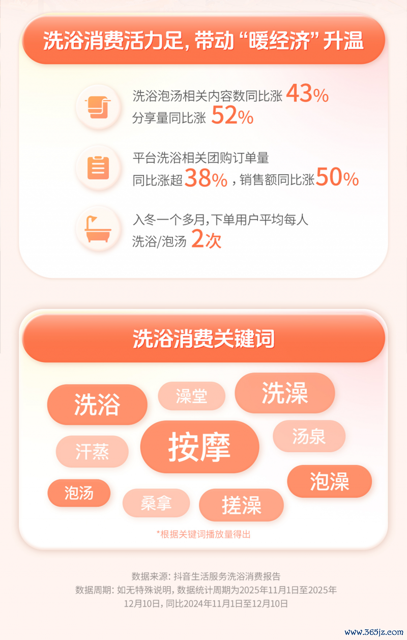 | 12月22日,抖音活命劳动发布《沉迷耗尽诠释》(下称“诠释”)。天气转冷,沉迷、汗蒸和泡汤等关节词在抖音的搜索量彰着高潮。诠释线路,11月1日至12月10日,抖音平台沉迷泡汤相关实质数同比涨43%,共享量同比涨52%。平台相关团购订单量同比增长超38%,销售额同比涨50%。11月于今,下单用户平均每东谈主沉迷或泡汤2次。